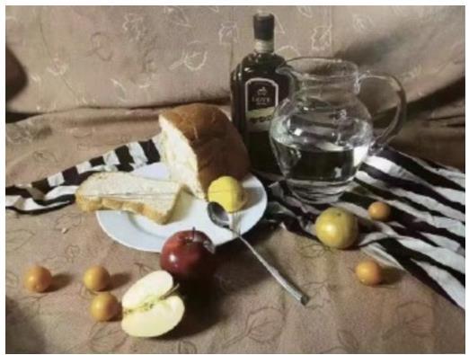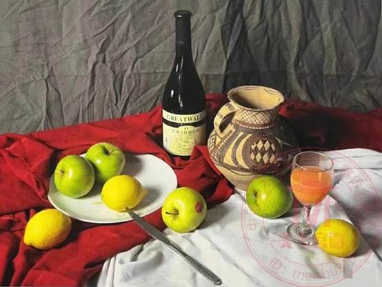 2023上海美術(shù)聯(lián)考色彩考題:照片模擬寫生,紅酒瓶、陶罐、綠蘋果、黃檸檬、高腳杯(盛有果汁)、白瓷盤、不銹鋼刀,紅色、白色、灰色襯布各一塊。